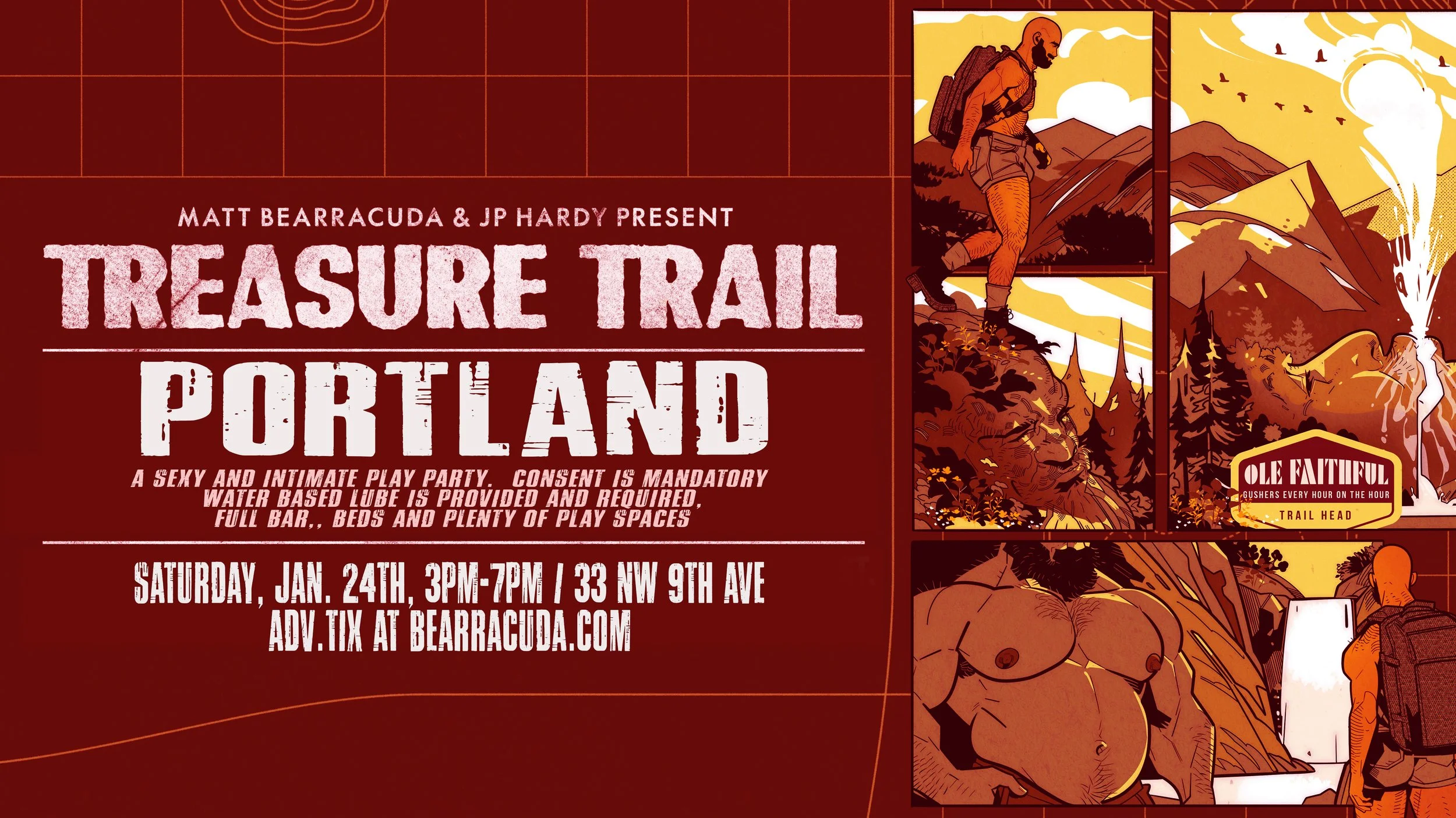Treasure Trail is a sexy and intimate play party in Downtown Portland. Consent is mandatory and only water based lube is allowed- some will be provided, but feel free to bring your own supply. Join 100s of furry fellas on Saturday afternoon, January 24th.